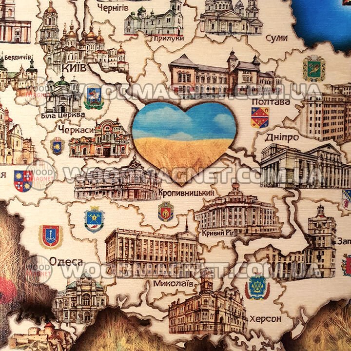 Дерев'яна карта України виготовлена на синьо - жовтому фоні нашого прапору та оздоблена українськими символами та визначними місцями кожного регіону, що може бути приємніше для очей? Ми пропонуємо яскраву, наповнену символами мапу, що буде радувати ваше серце не один рік. Екологічний матеріал і досвід нашого художника зроблять її унікальним доповненням до вашого будинку, квартири чи офісу. Карта пасує до будь якого інтер'єру, а кольори репрезентують наш культурний код.