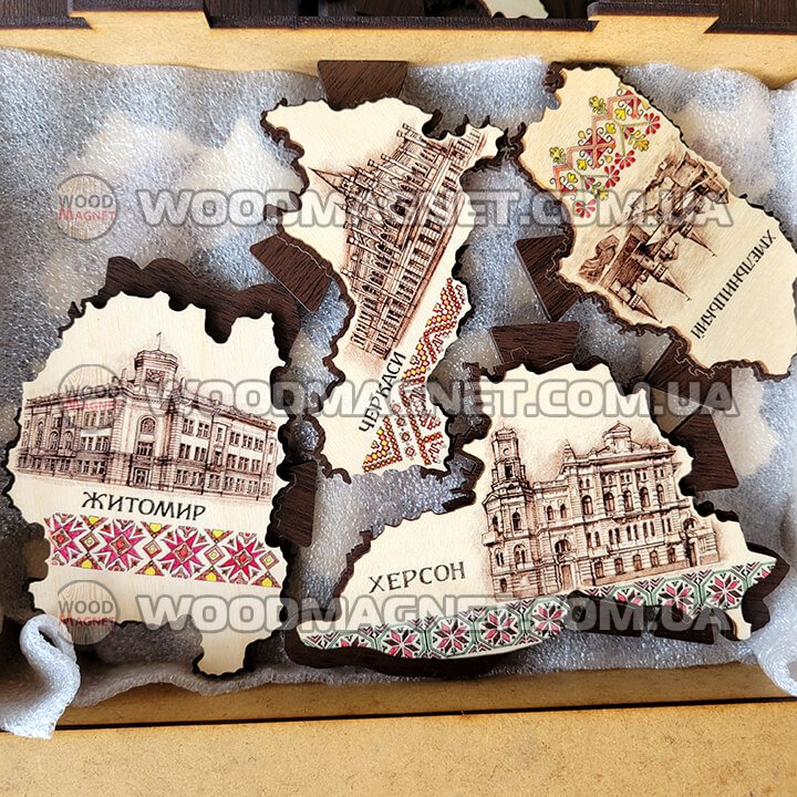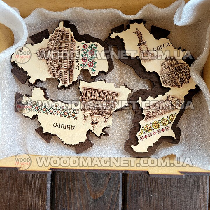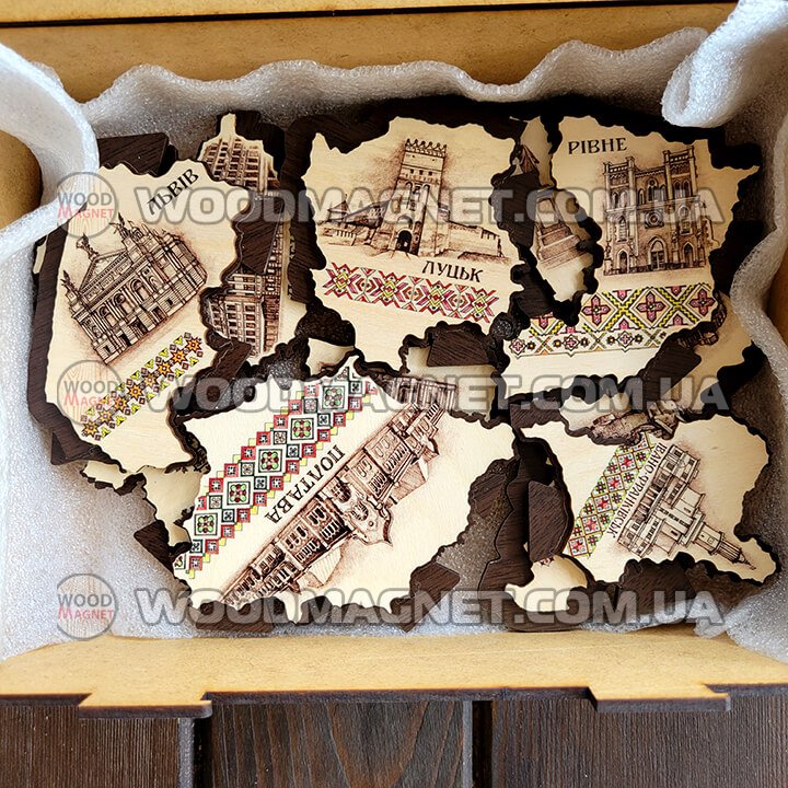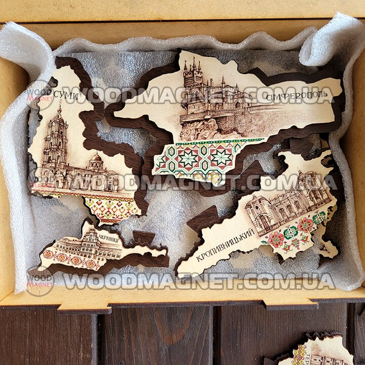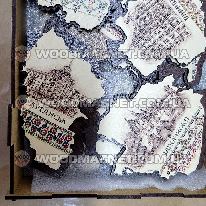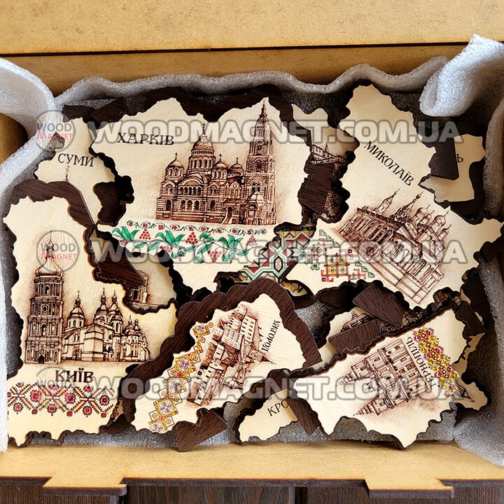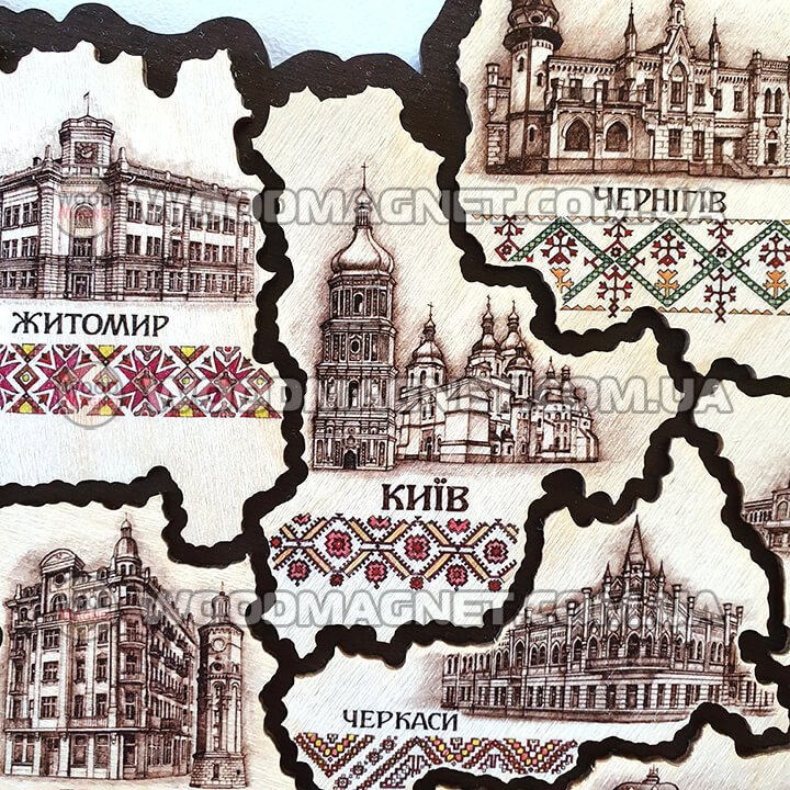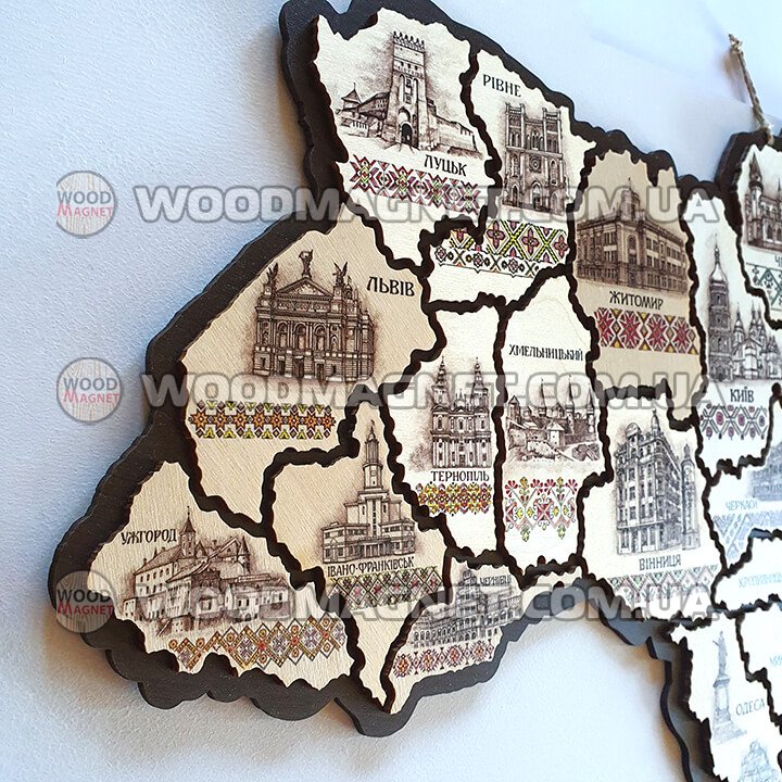 Дерев'яна мапа України-пазл буде яскравим та вишуканим доповненням до інтер"єру, як для офісу так і для квартири. Це художня робота, яка нанесена на дерево за допомогою високотехнологічного обладнання та не містить токсичних барвників. На ній зображені основні визначні місця кожної області нашої країни та українські орнаменти, притаманні певному регіону, Україна єдина, хоч кожна область має своє захоплююче, яскраве обличчя. Мапа виготовляється у вигляді пазлу по кожній області, який збирається перед монтажем мапи на стіну. Природність матеріалів та ручна художня робота надають карті неперевершений шарм та бездоганний вигляд:)) Даний виріб виготовляється у різних розмірах та упакований у дерев'яну коробку. Запрошуємо замовити собі відображення нашої великої, незламної країни, що має як декоративну так і географічну цінність.