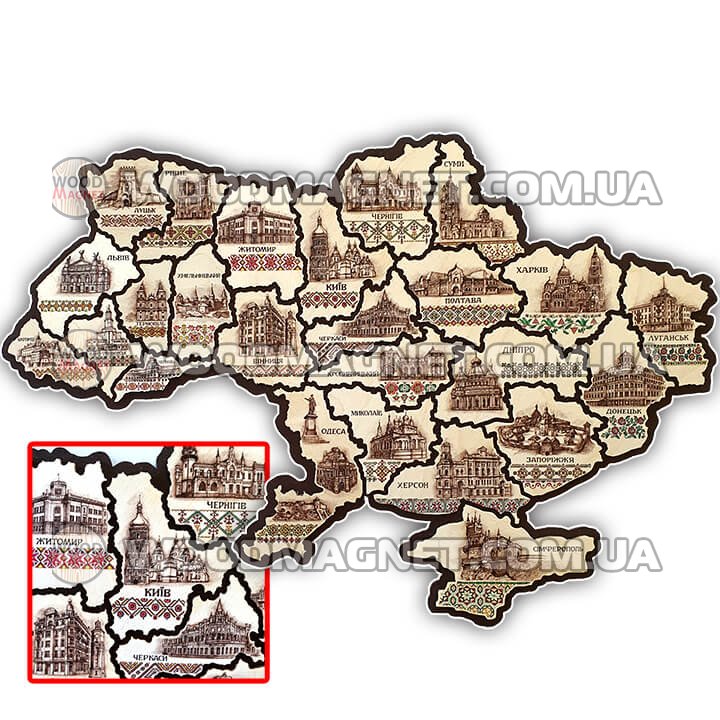 Дерев'яна мапа України-пазл буде яскравим та вишуканим доповненням до інтер"єру, як для офісу так і для квартири. Це художня робота, яка нанесена на дерево за допомогою високотехнологічного обладнання та не містить токсичних барвників. На ній зображені основні визначні місця кожної області нашої країни та українські орнаменти, притаманні певному регіону, Україна єдина, хоч кожна область має своє захоплююче, яскраве обличчя. Мапа виготовляється у вигляді пазлу по кожній області, який збирається перед монтажем мапи на стіну. Природність матеріалів та ручна художня робота надають карті неперевершений шарм та бездоганний вигляд:)) Даний виріб виготовляється у різних розмірах та упакований у дерев'яну коробку. Запрошуємо замовити собі відображення нашої великої, незламної країни, що має як декоративну так і географічну цінність.