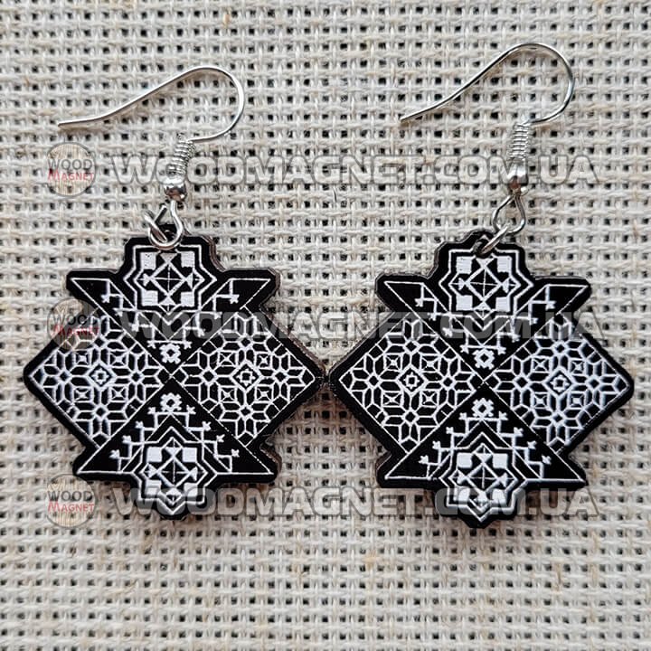 Еко сережки з дерева. Розмір приблизно 3*3*0,3 см. Зображення нанесено з двох сторін.Чудово пасують до вишиванок і не тільки:))
