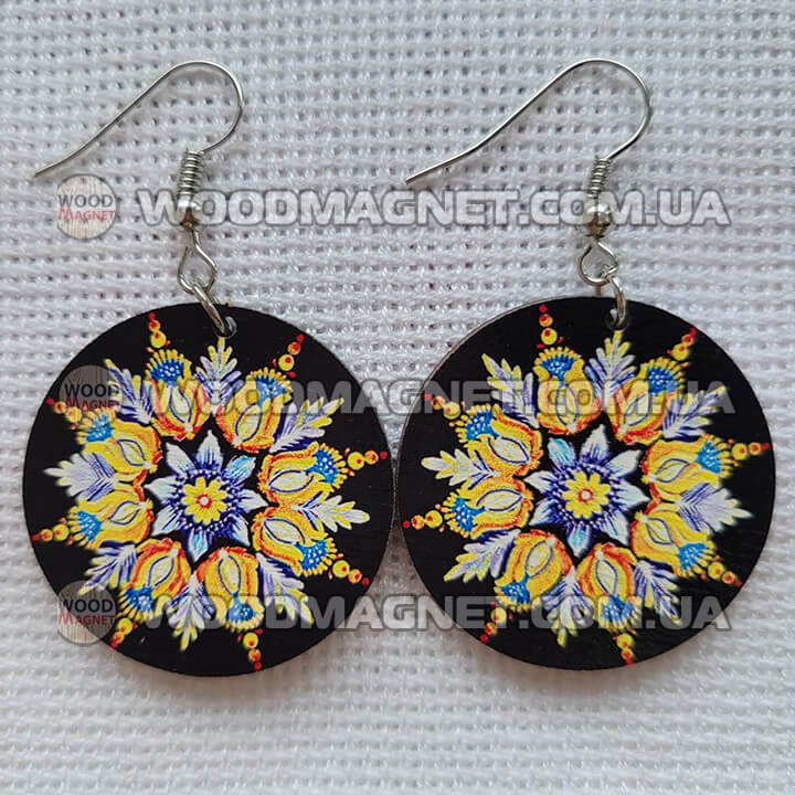 Еко сережки з дерева. Розмір приблизно 3*3*0,3 см. Зображення нанесено з двох сторін.Чудово пасують до вишиванок і не тільки:))