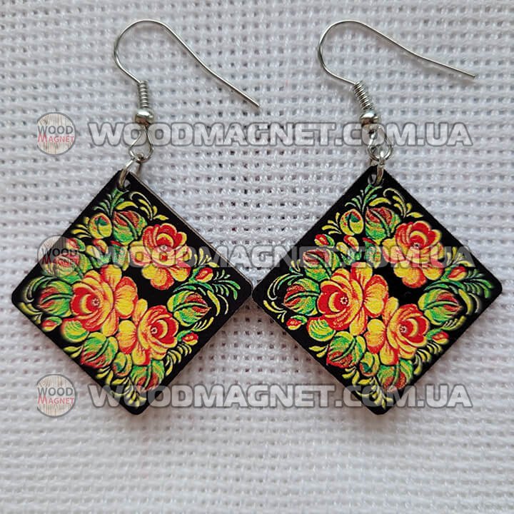 Еко сережки з дерева. Розмір приблизно 3*3*0,3 см. Зображення нанесено з двох сторін.Чудово пасують до вишиванок і не тільки:))