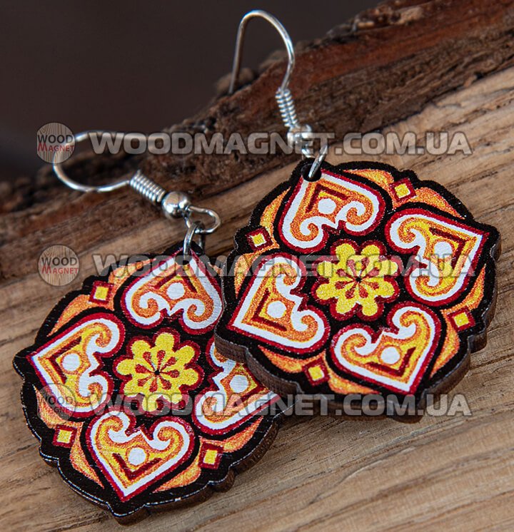 Еко сережки з дерева. Розмір приблизно 3*3*0,3 см. Зображення нанесено з двох сторін.Чудово пасують до вишиванок і не тільки:))