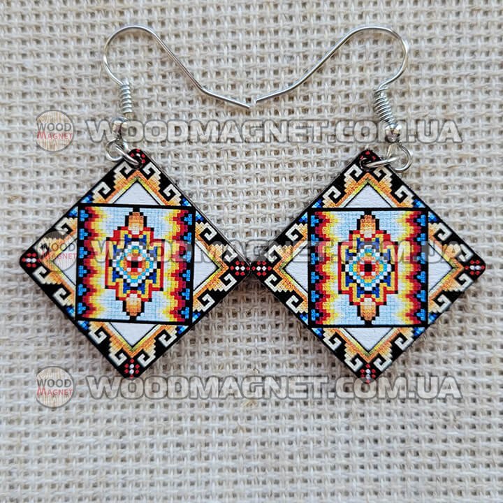 Еко сережки з дерева. Розмір приблизно 3*3*0,3 см. Зображення нанесено з двох сторін.Чудово пасують до вишиванок і не тільки:))