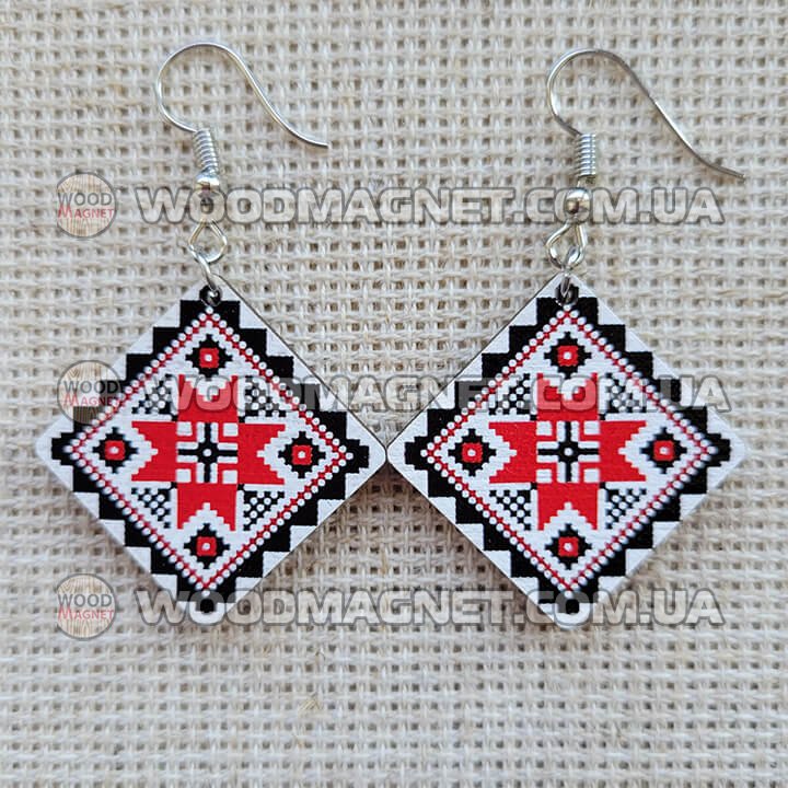 Еко сережки з дерева. Розмір приблизно 3*3*0,3 см. Зображення нанесено з двох сторін.Чудово пасують до вишиванок і не тільки:))