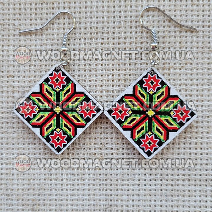 Еко сережки з дерева. Розмір приблизно 3*3*0,3 см. Зображення нанесено з двох сторін.Чудово пасують до вишиванок і не тільки:))