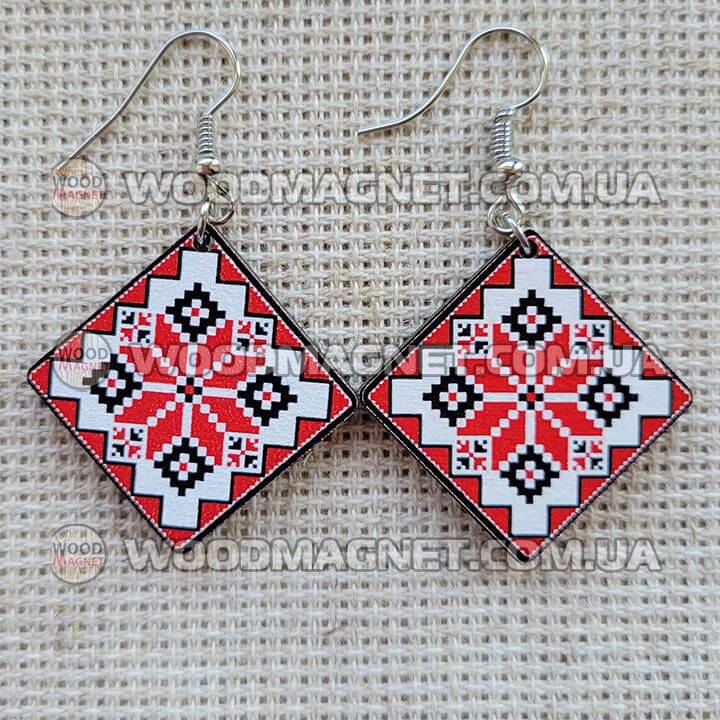 Еко сережки з дерева. Розмір приблизно 3*3*0,3 см. Зображення нанесено з двох сторін.Чудово пасують до вишиванок і не тільки:))