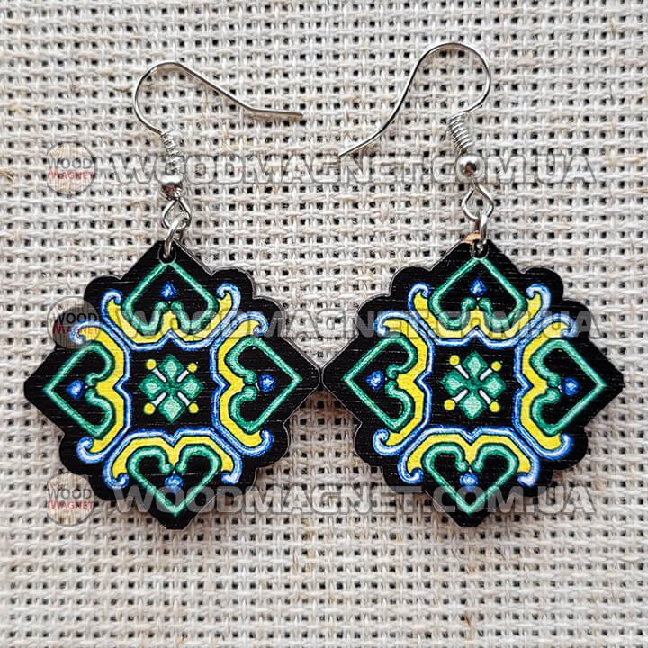 Еко сережки з дерева. Розмір приблизно 3*3*0,3 см. Зображення нанесено з двох сторін.Чудово пасують до вишиванок і не тільки:))