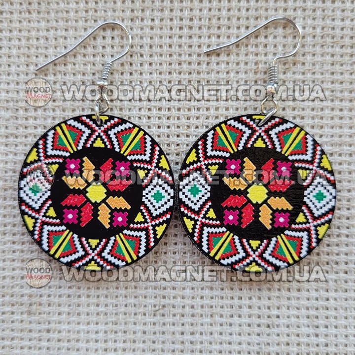 Еко сережки з дерева. Розмір приблизно 3*3*0,3 см. Зображення нанесено з двох сторін.Чудово пасують до вишиванок і не тільки:))