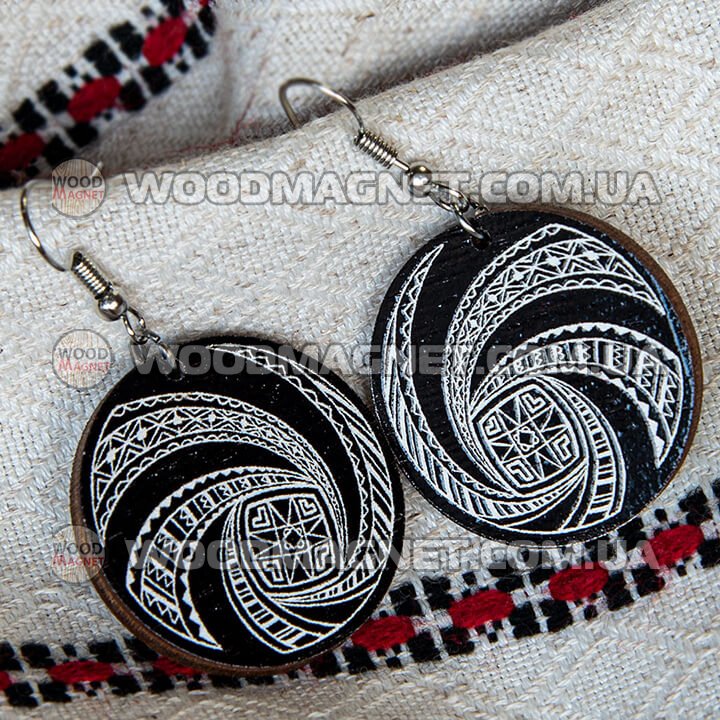 Еко сережки з дерева. Розмір приблизно 3*3*0,3 см. Зображення нанесено з двох сторін.Чудово пасують до вишиванок і не тільки:))