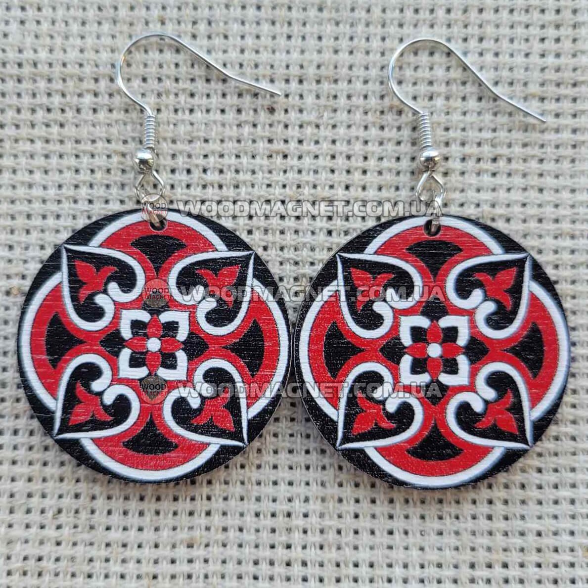 Еко сережки з дерева. Розмір приблизно 3*3*0,3 см. Зображення нанесено з двох сторін.Чудово пасують до вишиванок і не тільки:))