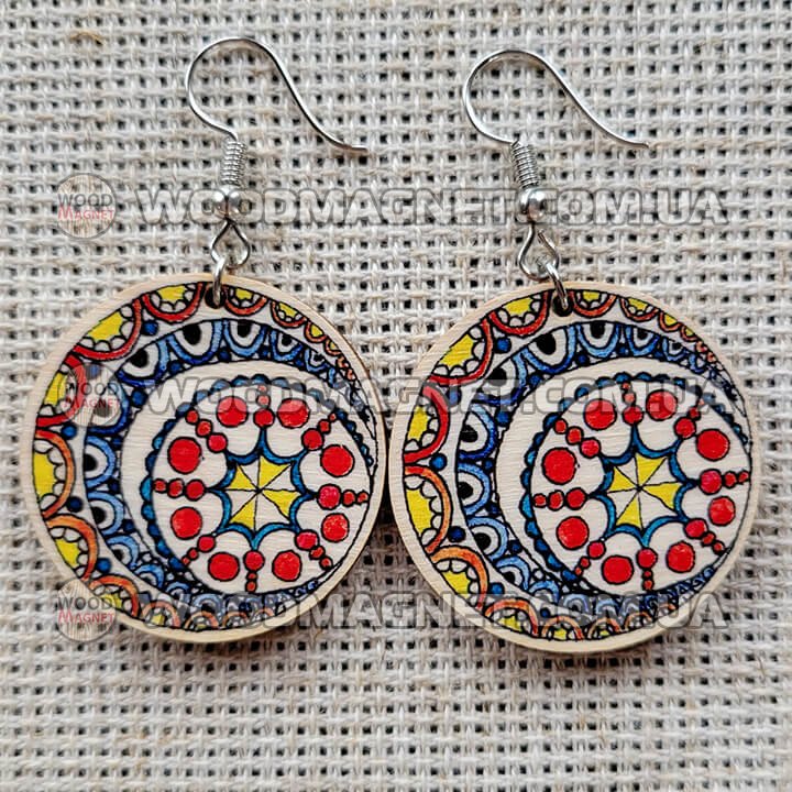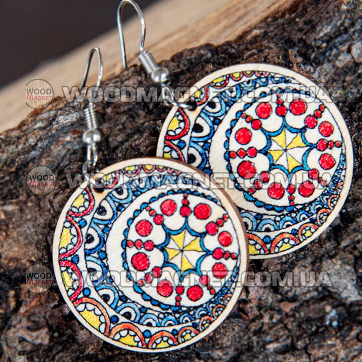 Еко сережки з дерева. Розмір приблизно 3*3*0,3 см. Зображення нанесено з двох сторін.Чудово пасують до вишиванок і не тільки:))